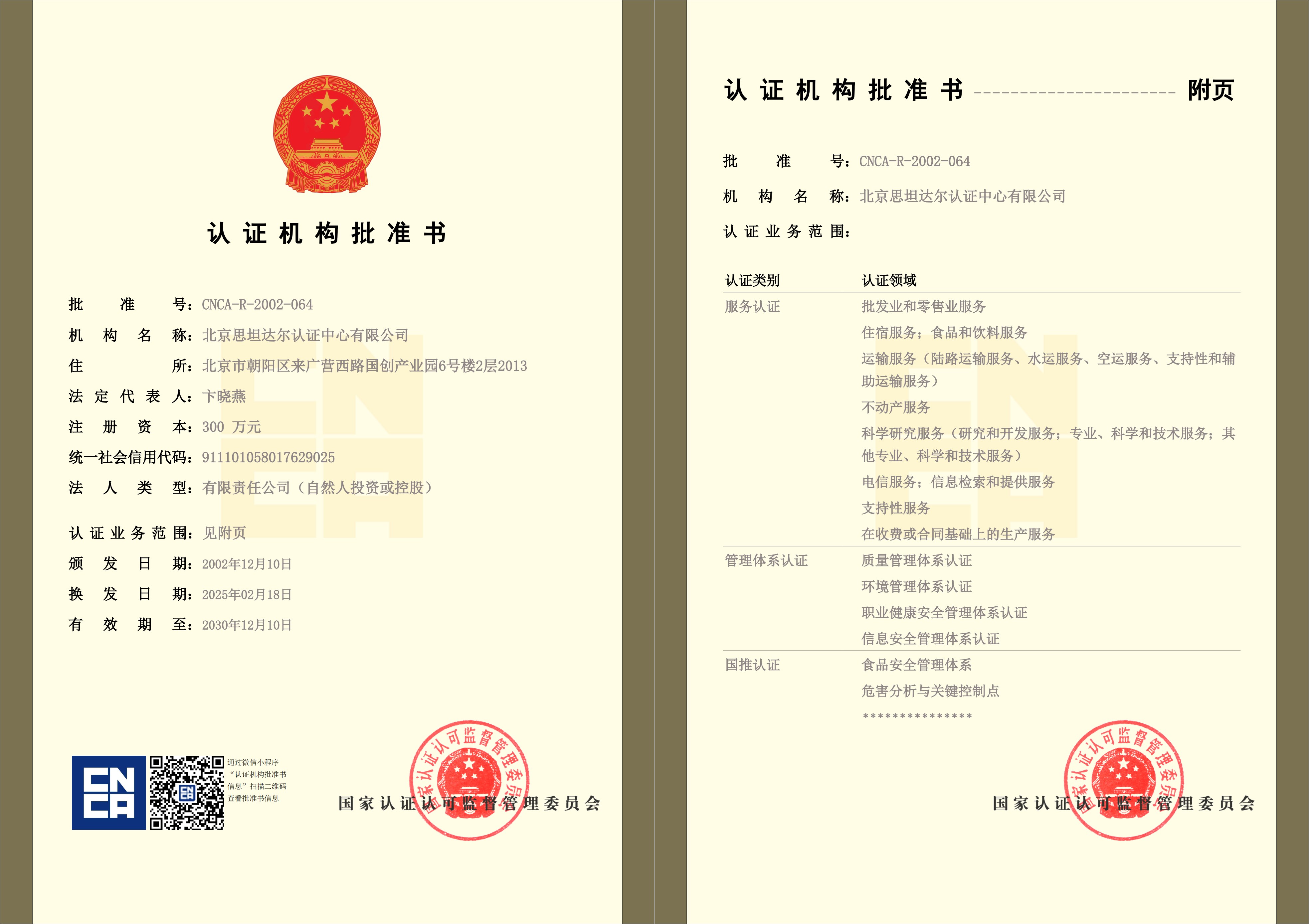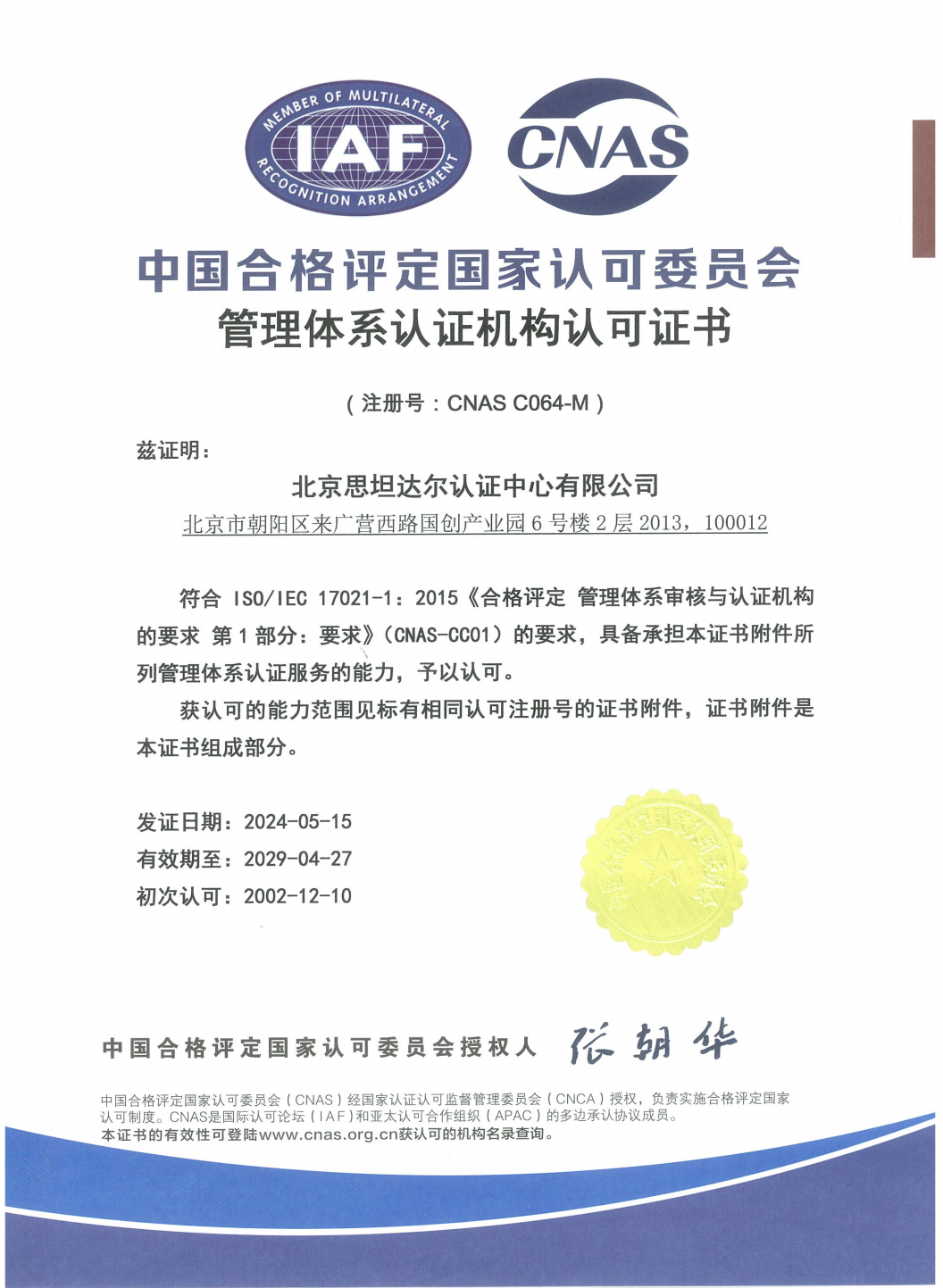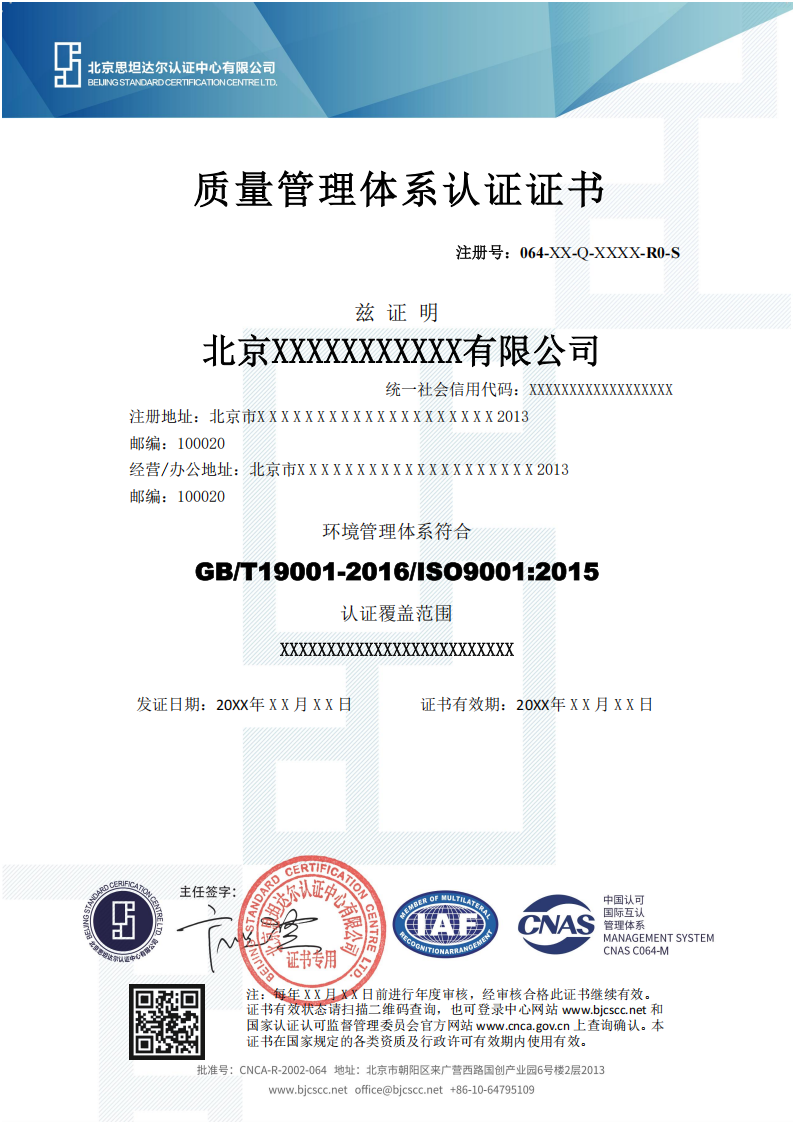 质量管理体系(QMS)认证经国家认证认可 监督管理委员会(CNCA)批准,且同年获得中国认证认可委员会(CNAS)认可,并正式开展认证活动