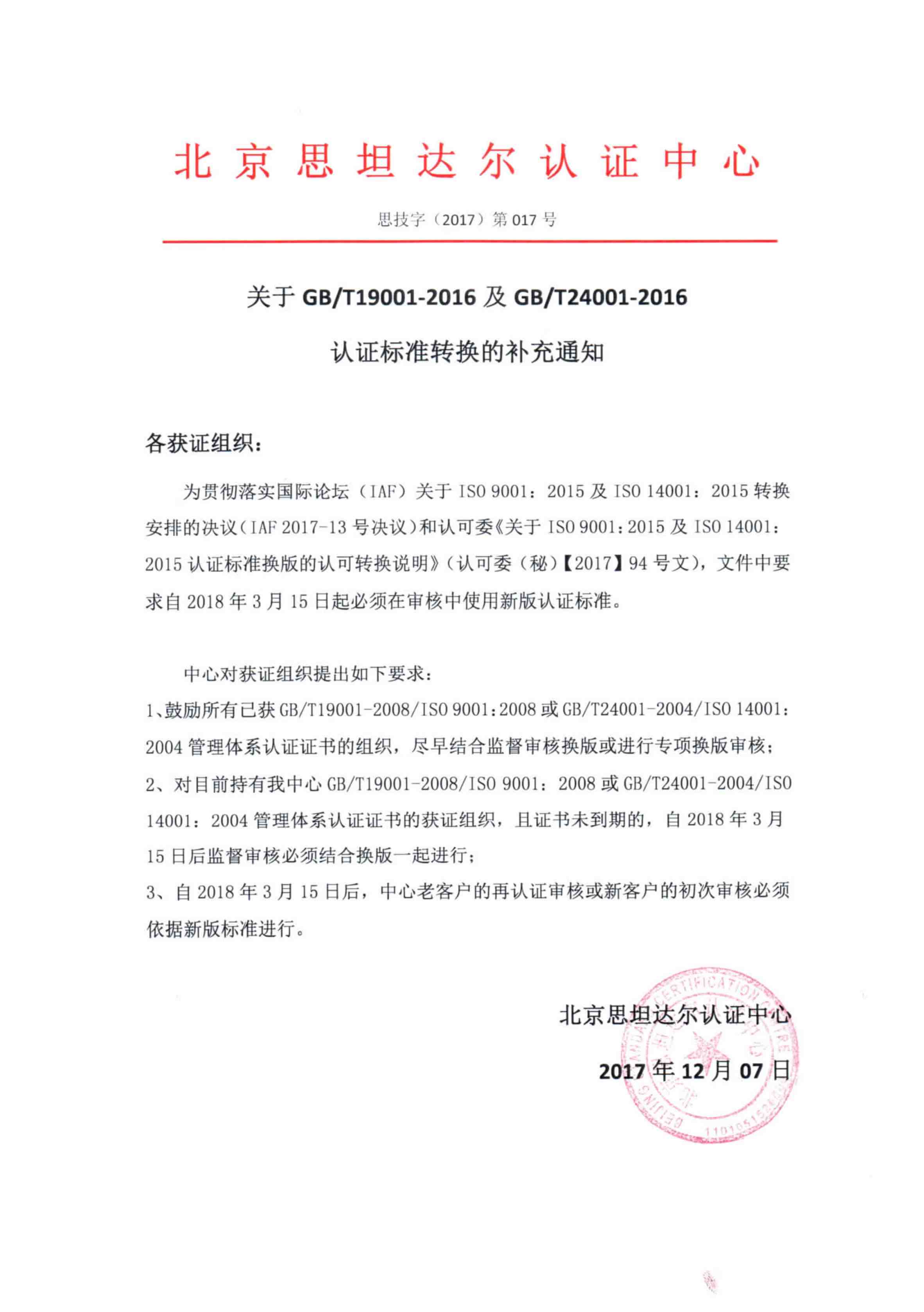 关于GB/T19001-2016及GB/T24001-2016认证标准转换