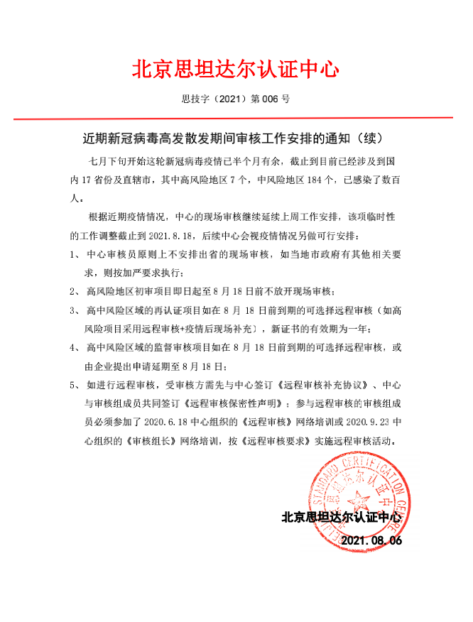 思技字(2021)第006号《近期新冠病毒高发散发期间审核工作安排的通知(续)》