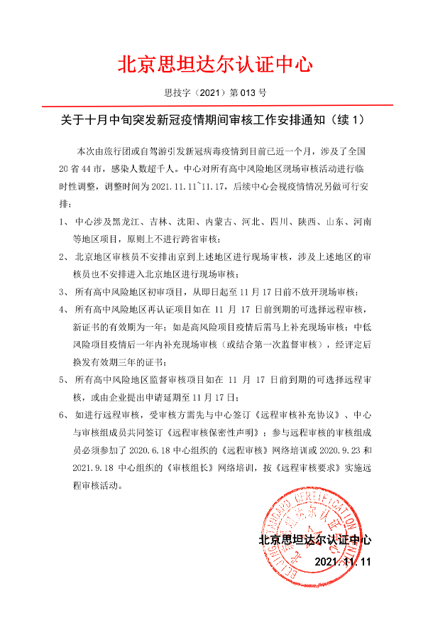 思技字(2021)第013号《关于十月中旬突发新冠疫情期间审核工作安排通知(续1)》